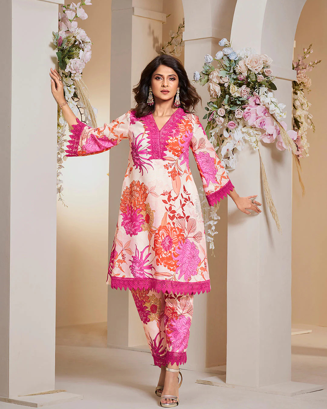 PRINTED FLORAL PRINT CO-ORD SET HAS A V NECK STYLE KURTI WITH STRAIGHT PANT