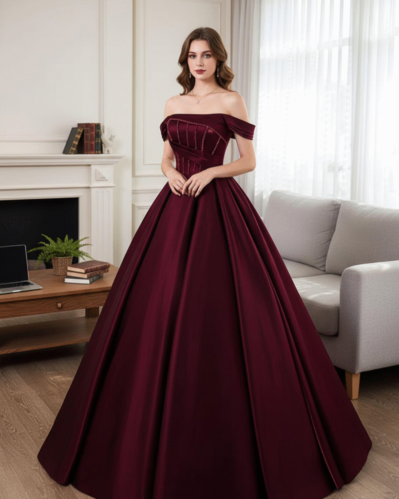 MAROON OFF-SHOULDER BALL GOWN PERFECTLY DESIGNED FOR YOUR WEDDING SEASON
