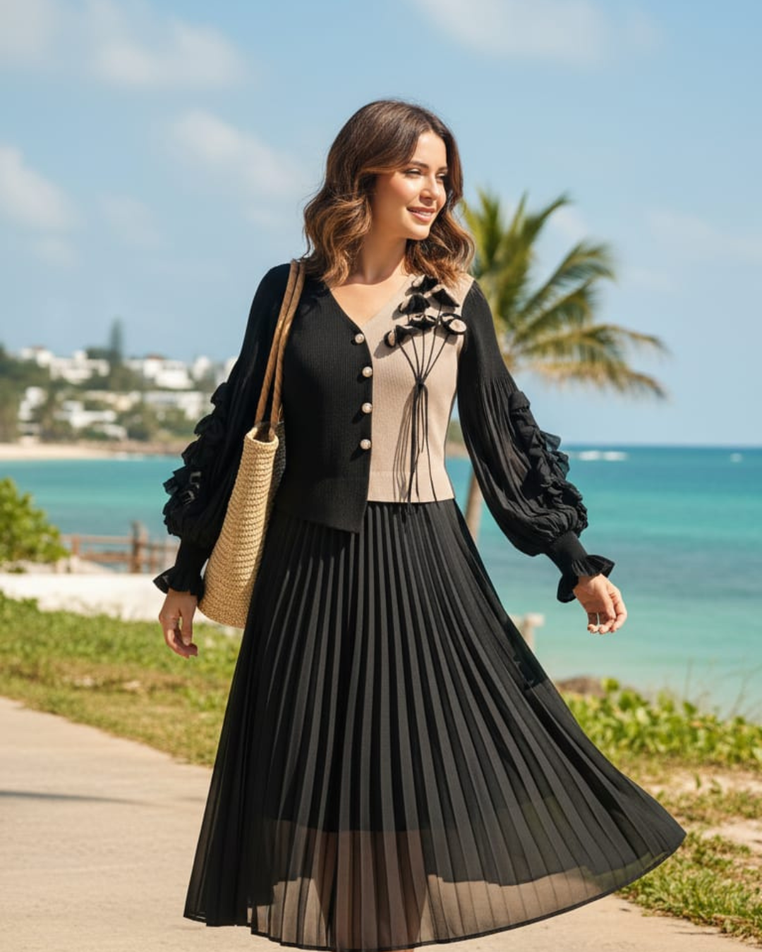 STUNNING BLACK AND CREAM ONE-PIECE WITH PUFF SWLEVES TOP AND FLARE SKIRT STYLE DFRESS