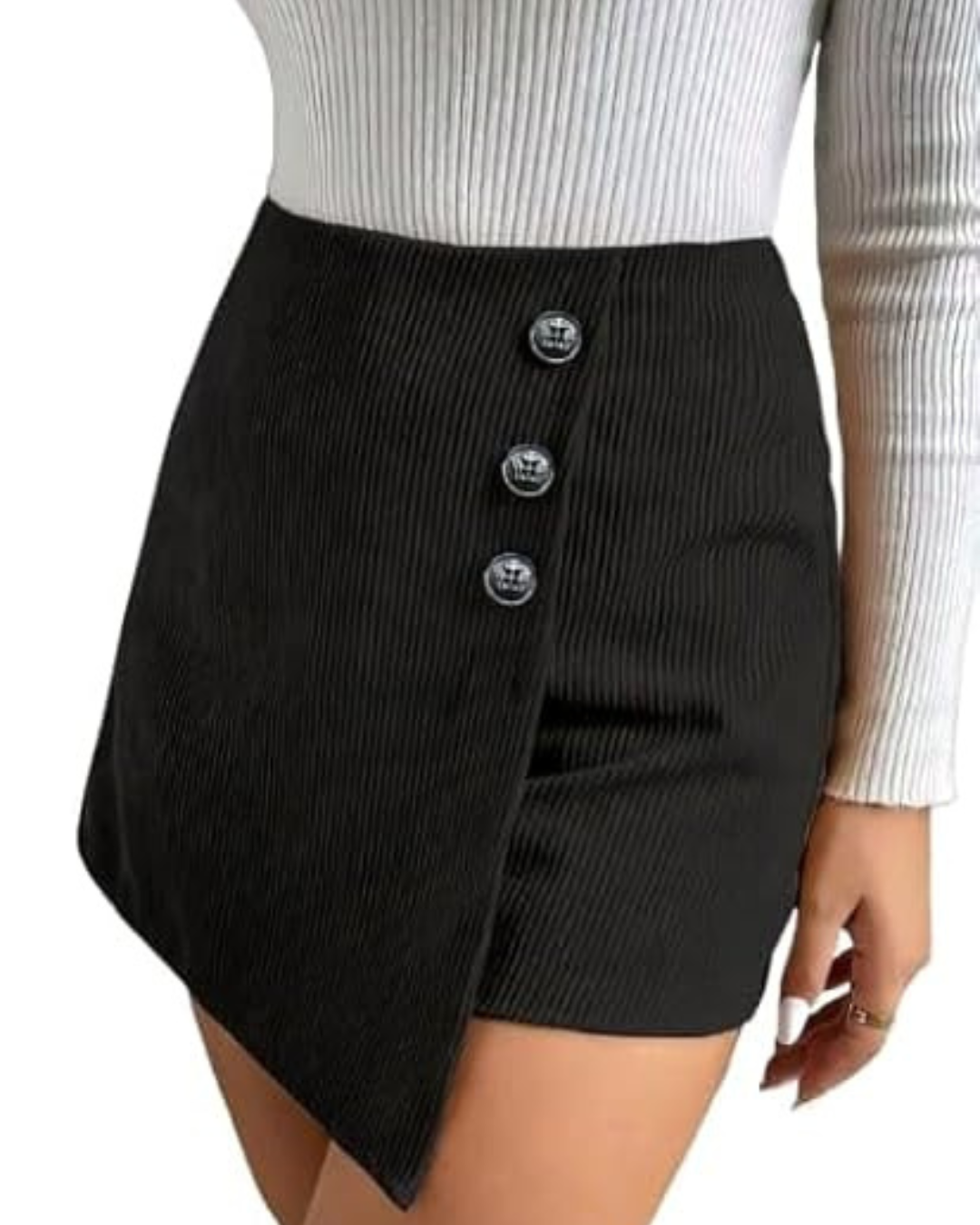 CHECK OUT THIS BLACK MINI SKIRT WHICH HAS THREE BUTTONS GIVING IT A CLASSY LOOK